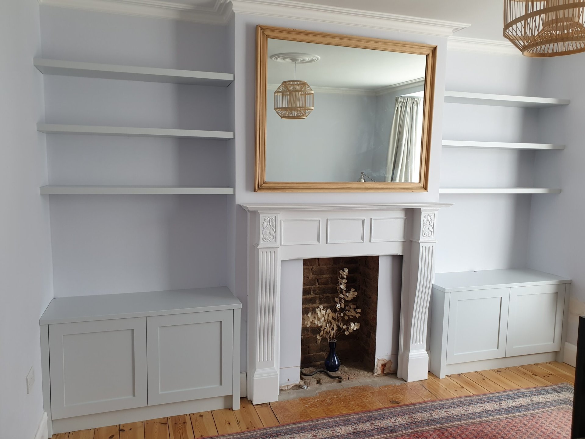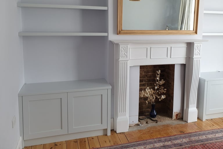 The main feature of these bespoke alcoves is that the shelving units above the cabinets are not in line with the chimney breast and sticking out by a few inches. This is a very good idea for the shallow alcoves in order to maximize the shelving space. It also doesn't look bad at all especially the cornice around the corner of the top of the shelving unit.